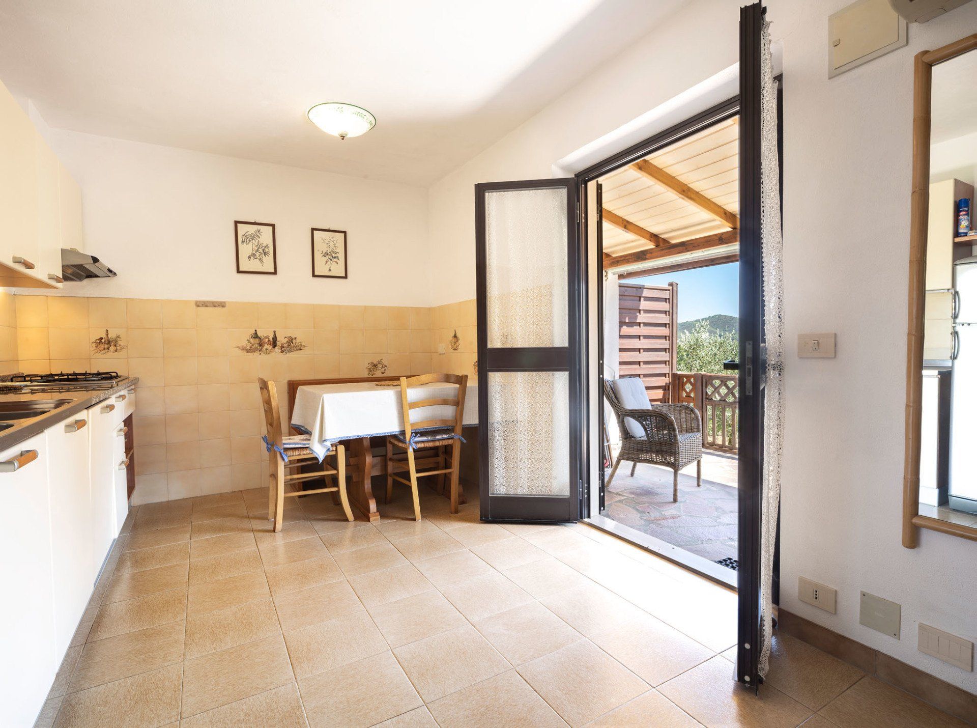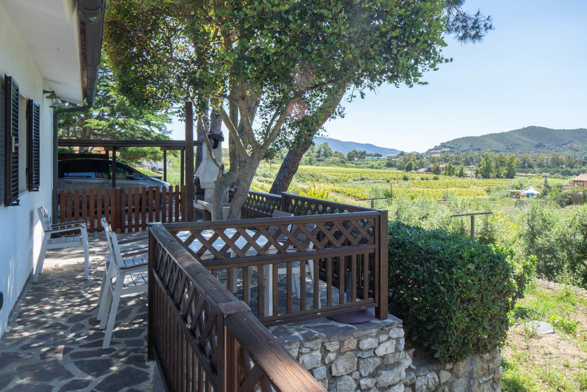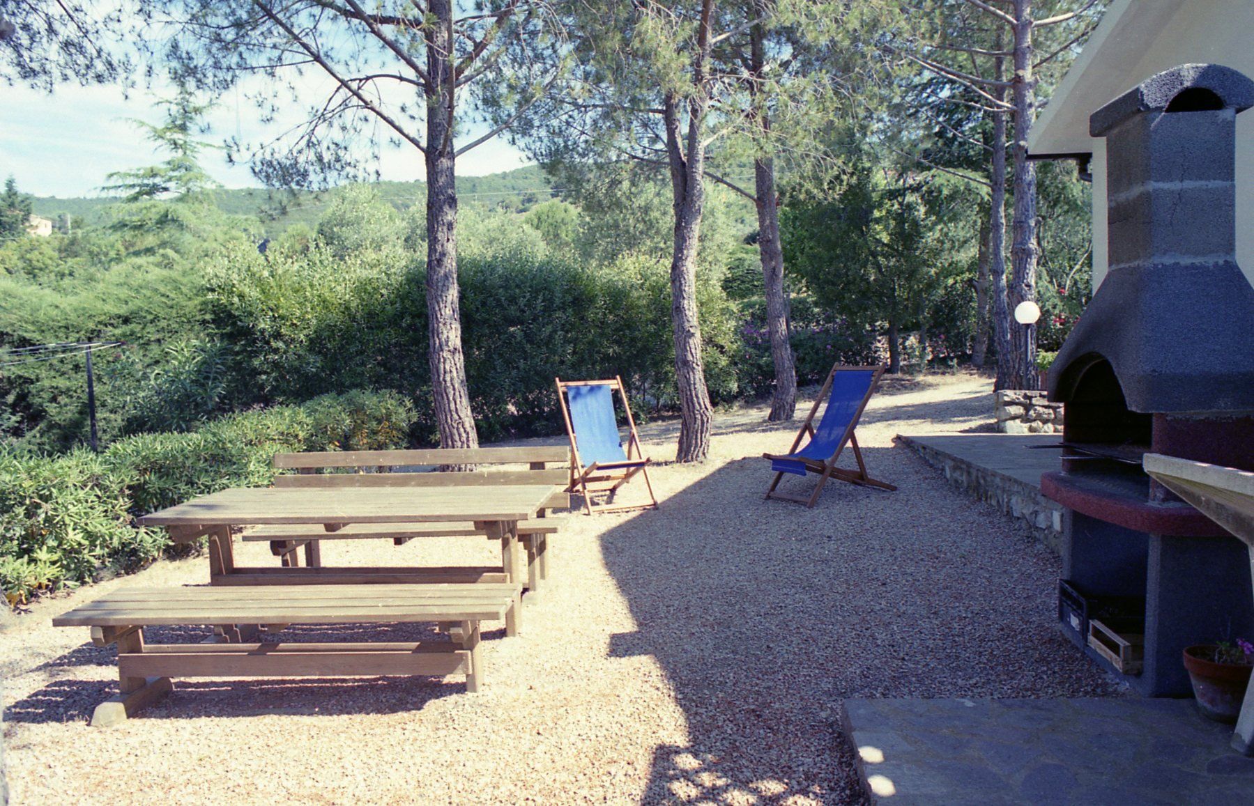 All'esterno vi è un ampio terrazzo coperto di circa 20 mq e un giardino con barbecue.